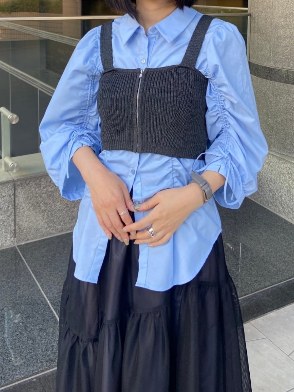 tea._.coのスカート「メッシュティアード切替スカート」を使ったコーディネート