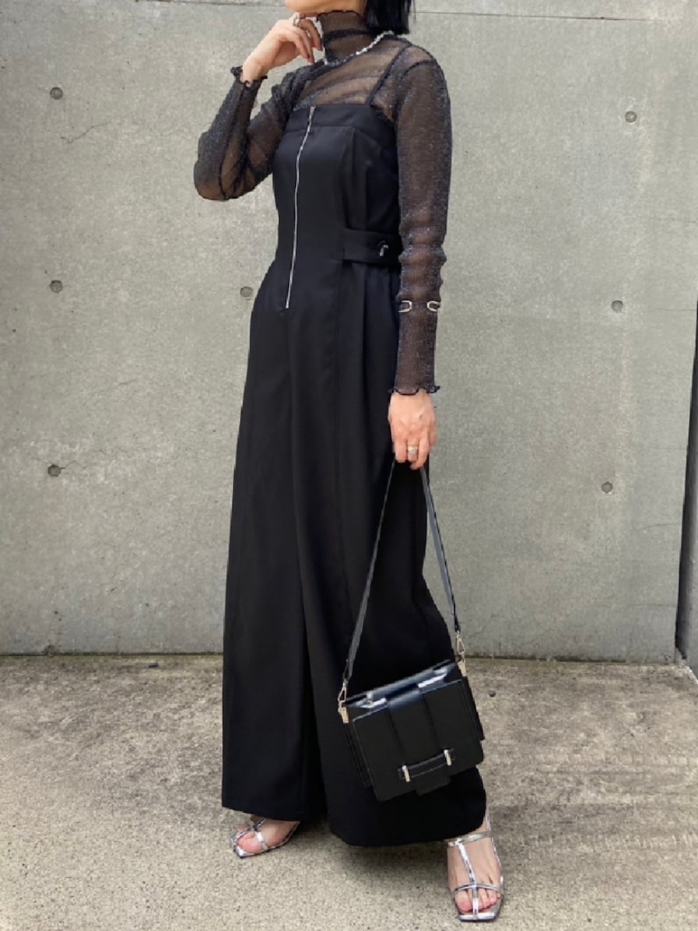 普段使いにも大活躍中のベアロンパースにラメシアーインナーをレイヤードしてお呼ばれコーデに☆ きちんと感とインパクトを兼ね備えた新作にスクエアBAGの存在感も◎ インナーもロンパースもバッグも着回し力が高すぎて毎日の様に手にとってしまうスタメン達★