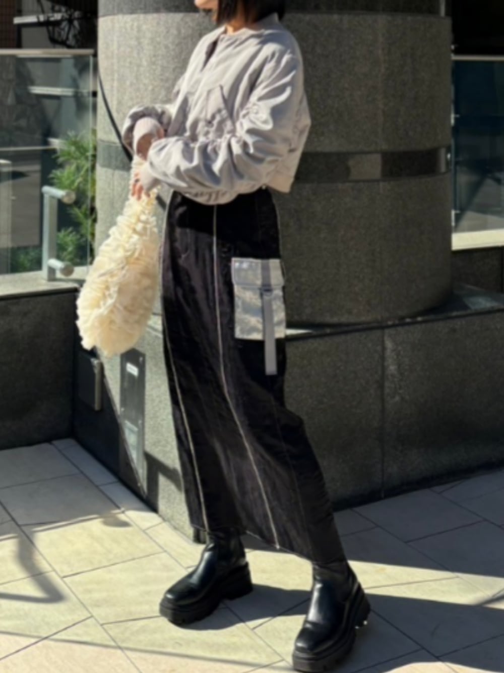 ワークポケットバイカラータイトスカートはメタリック糸を織り込んだ光沢素材を立体的なシワ加工で仕上げた唯一無二の素材感☆ 縦切替のバイカラーパイピングでスリム見え効果抜群のタイトスカート★ 2WAY中綿ブルゾンはショートバージョンで合わせれば、脚長効果抜群!! ワーク×フェミニンのバランスが絶妙なコーディネート☆