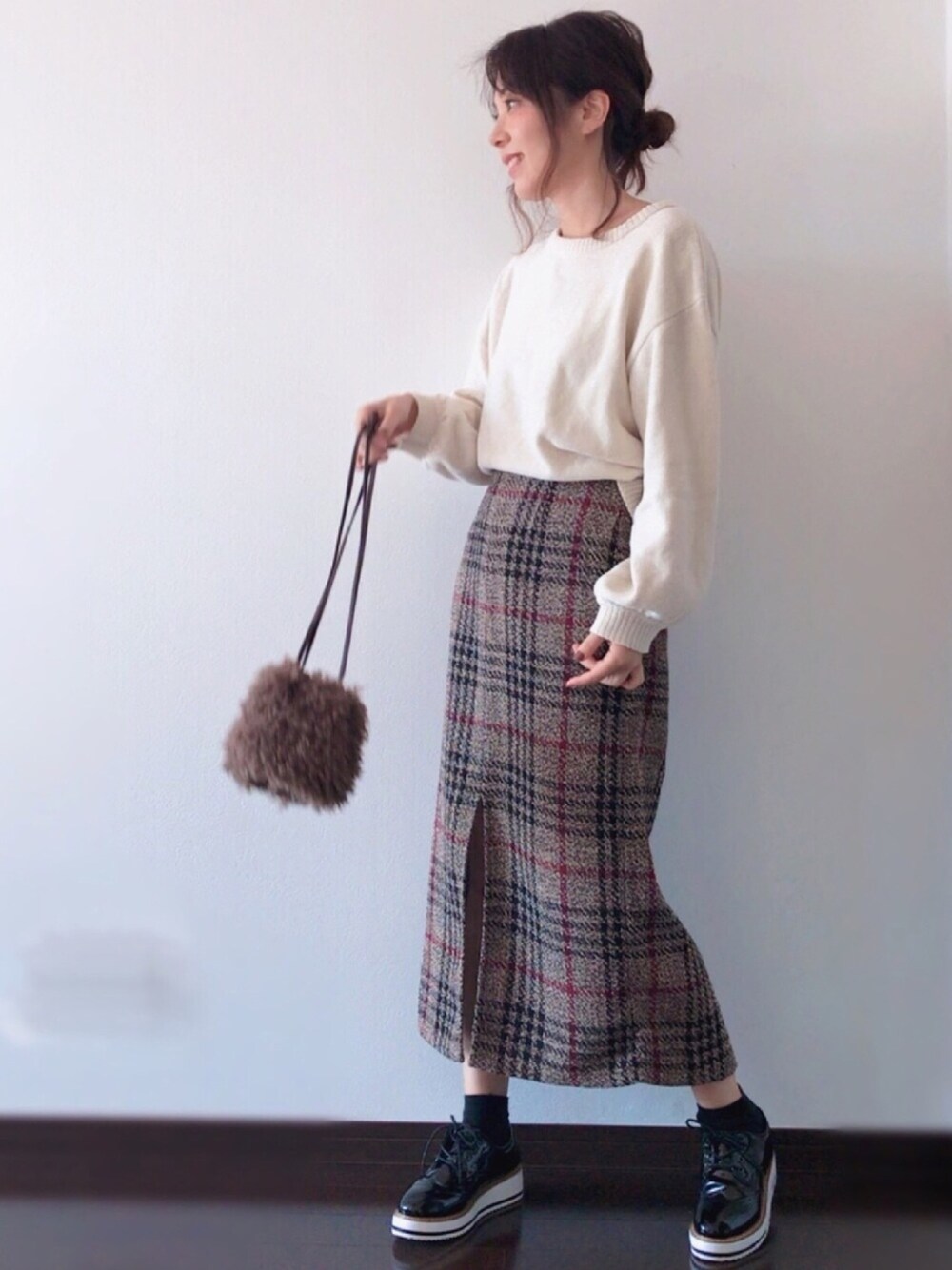 フー,チコさんのチェックスカート可愛いくてヤバいです💕 アウターは、ショートダウン