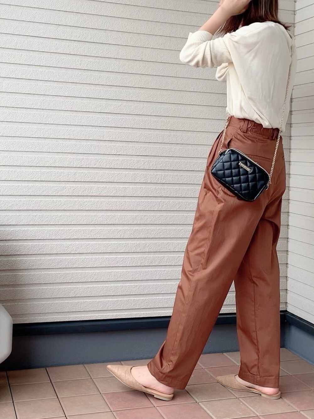 chaco closetさんのVネックニットを着用しています。 ドルマン型ですが、袖部分がしまっていてメリハリがでるので、シンプルコーデのポイントになりとっても良きです。 コットンニットなので、肌触りも抜群です✨