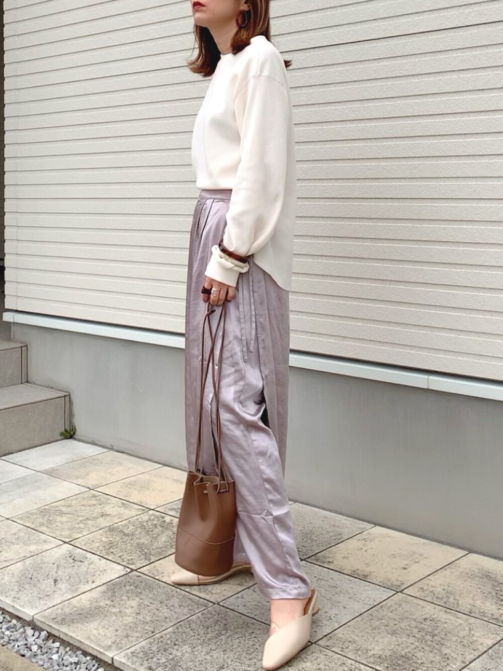 セレクトモカさんのサテンパンツ、ラップスカートがレイヤード風になっているので、1枚でおしゃれ感増して、とっても良きです◎ ベージュと迷いましたが、ラベンダーの色味がくすみカラーなので、合わせやすく春らしくなり良かったです。