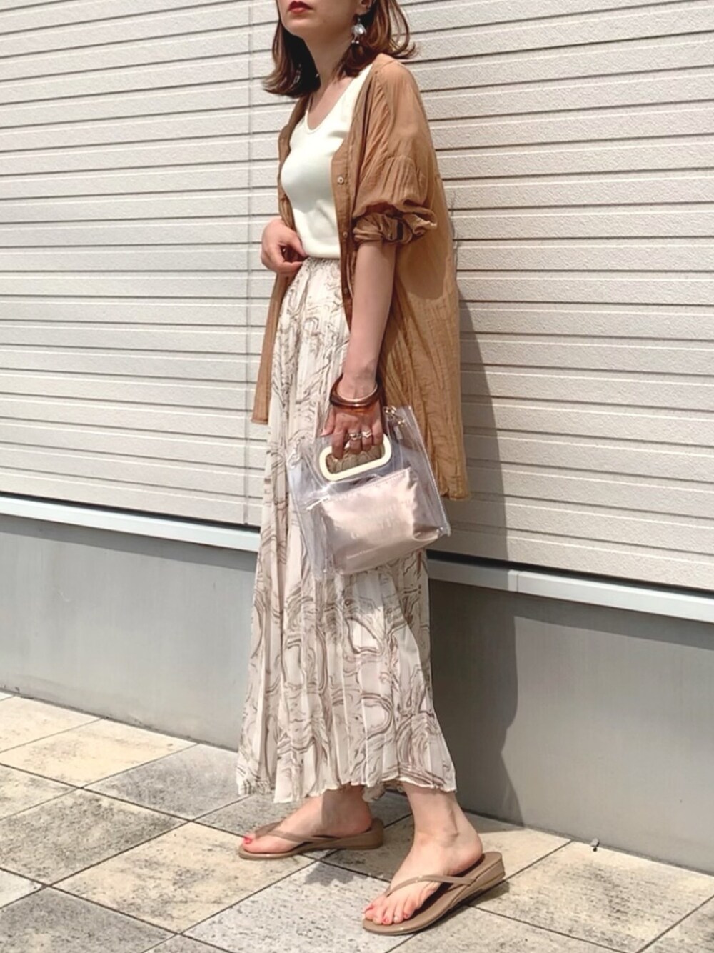 DHOLICさんのマーブリング柄のプリーツスカート、今年っぽ柄でくすみカラーも合わせ安いです✨ シアーシャツを合わせて、大人っぽコーデ✨ TikTok☞@sae370