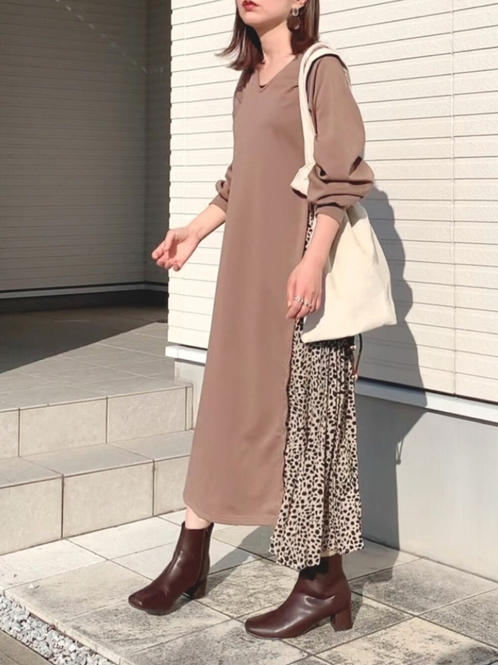 ルーミーズのサイドプリーツワンピース、レオパード柄の新色が追加販売されました✨ シンプルワンピに、さりげないレオパード柄がポイントになって、秋らしくとても可愛いです☺️