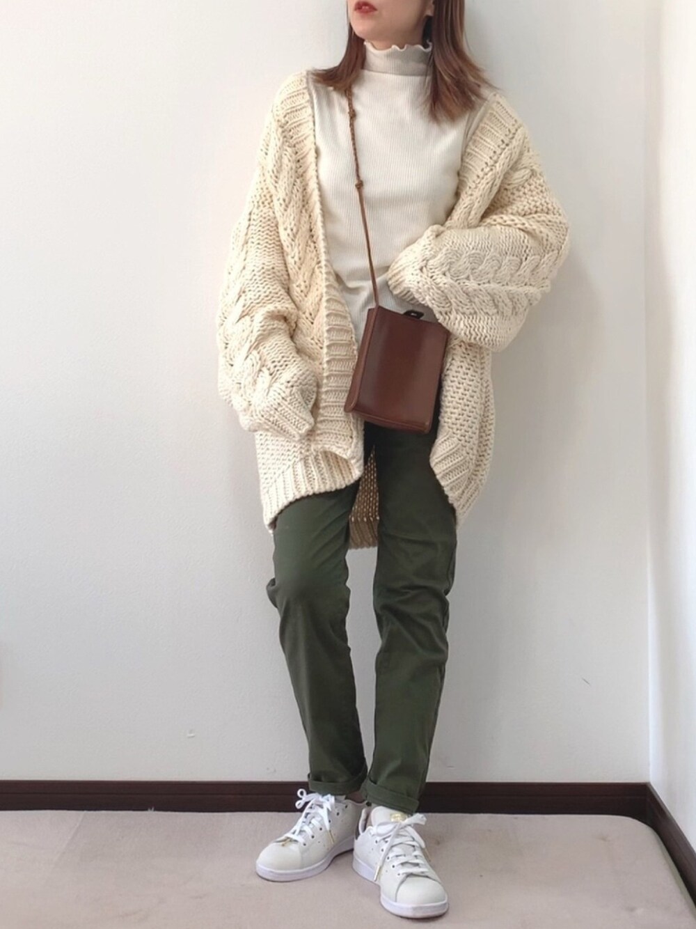 オーバーサイズで、ボリューム感が可愛いchillfarのケーブルニットカーディガン🧶 ボトムスはハイウエストで美脚効果ありのテーパードスリムパンツで、スッキリシルエットに✨