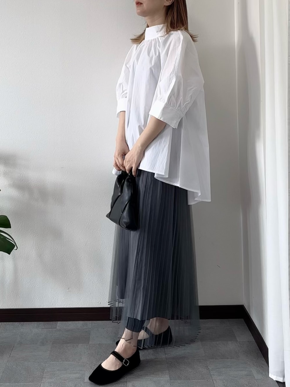 紗衣のシャツ/ブラウス「◆スタンドカラーチュニックフレアブラウス【洗濯機洗い可】」を使ったコーディネート