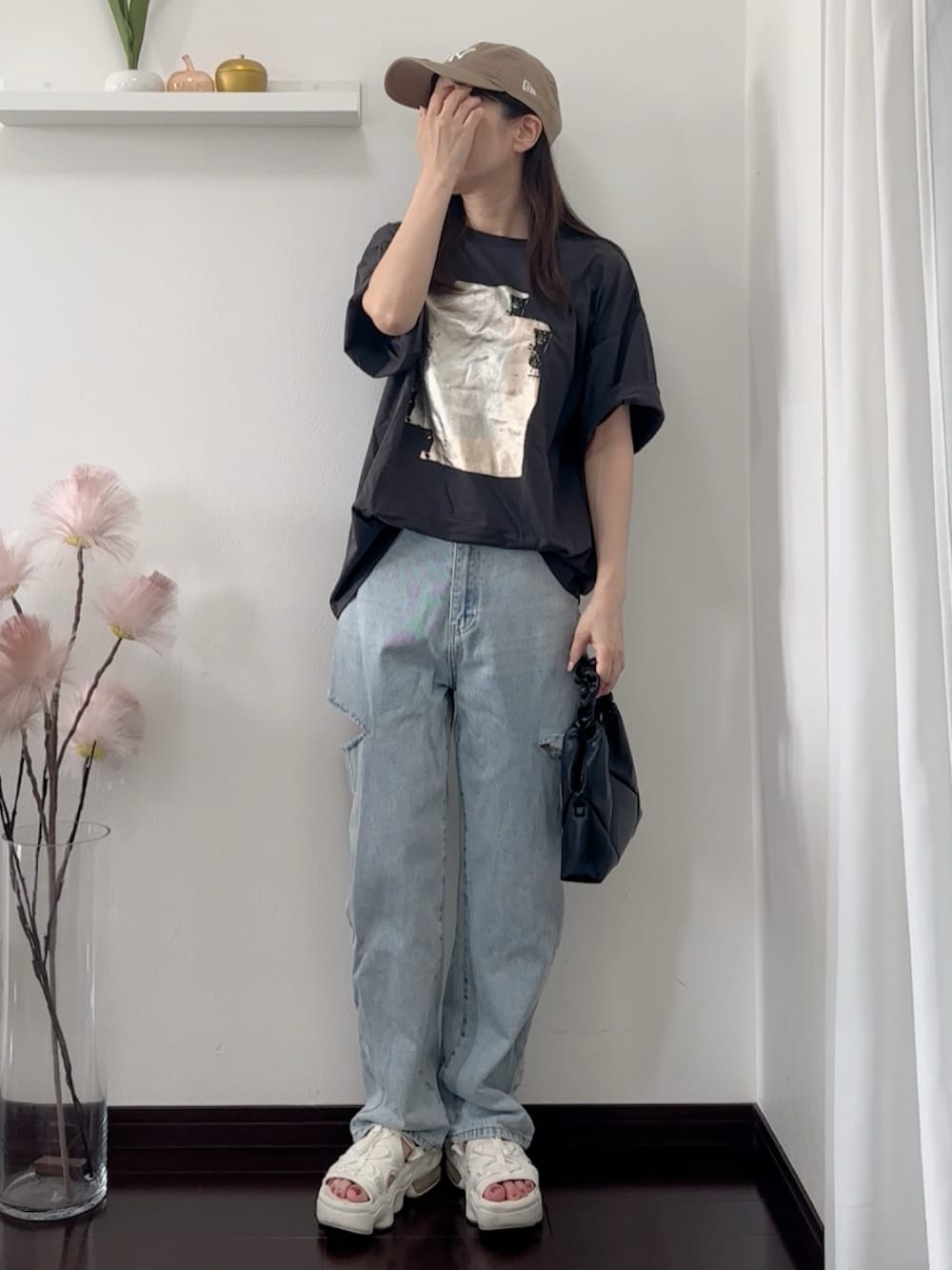 紗衣のTシャツ/カットソー「箔プリント半袖BIGTシャツ」を使ったコーディネート