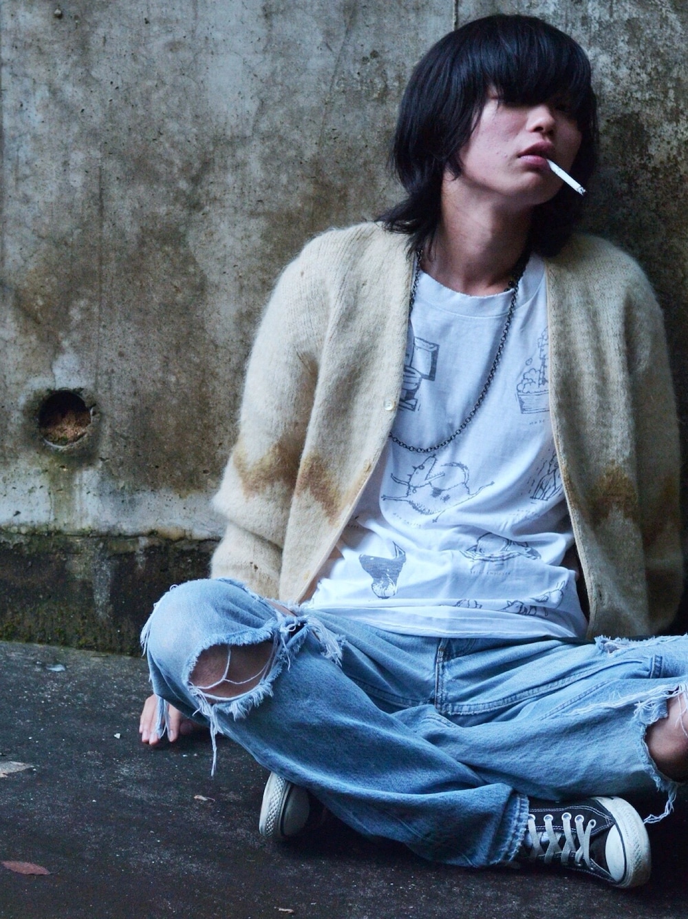 白浜にて!最終弾!!! THEグランジ! ニットカーディガン、犬Tシャツ、ダメージデニム、コンバース、タバコ カートコバーン様を意識させていただきましたwww このコーデは本当にお気に入りで、雰囲気を重視させました! 早くこのコーデを苦なく着れる季節になってほしいです笑 あともーちょっと頑張ってタバコ吸えるよーになります笑
