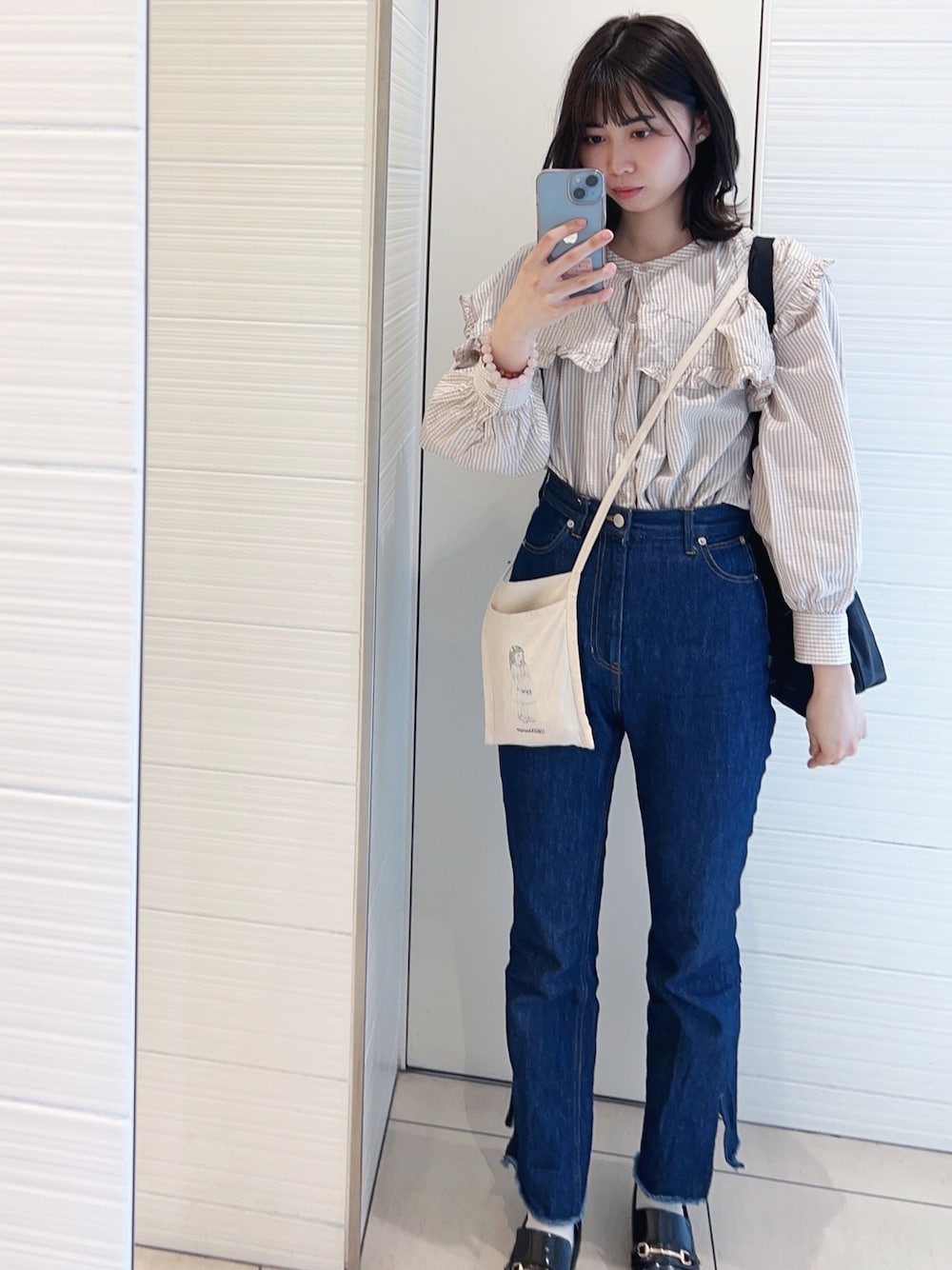 . 少し肌寒い日とかはブラウスとデニムパンツな事が多いです😌 ローリーズファームのパンツはマルチサイズで、ZOZO限定で買いました! 自分に合った最適なサイズが選べれるのがとても良い!!