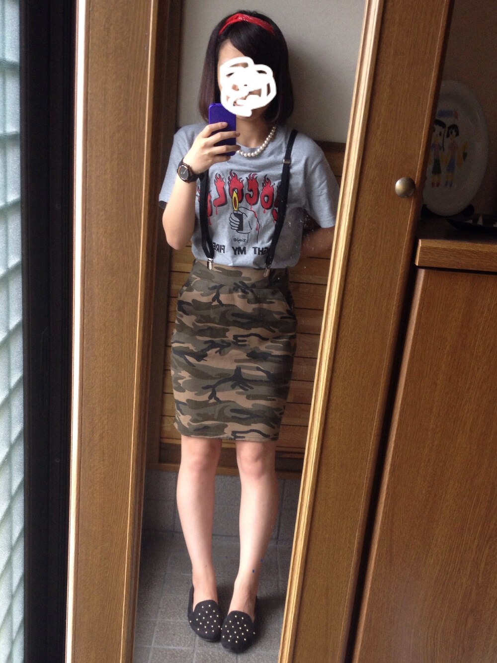 トップス:COCOLObland スカート:ANOTHER BRANCH 靴:GU サスペンダー:GU バンダナ:? 時計:NIXON ネックレス:? デニムのタイトスカートか、カモフラスカート悩んで悩んで悩んで、どっちもアップしてみた(°_°) どっちが良かったかな〜?