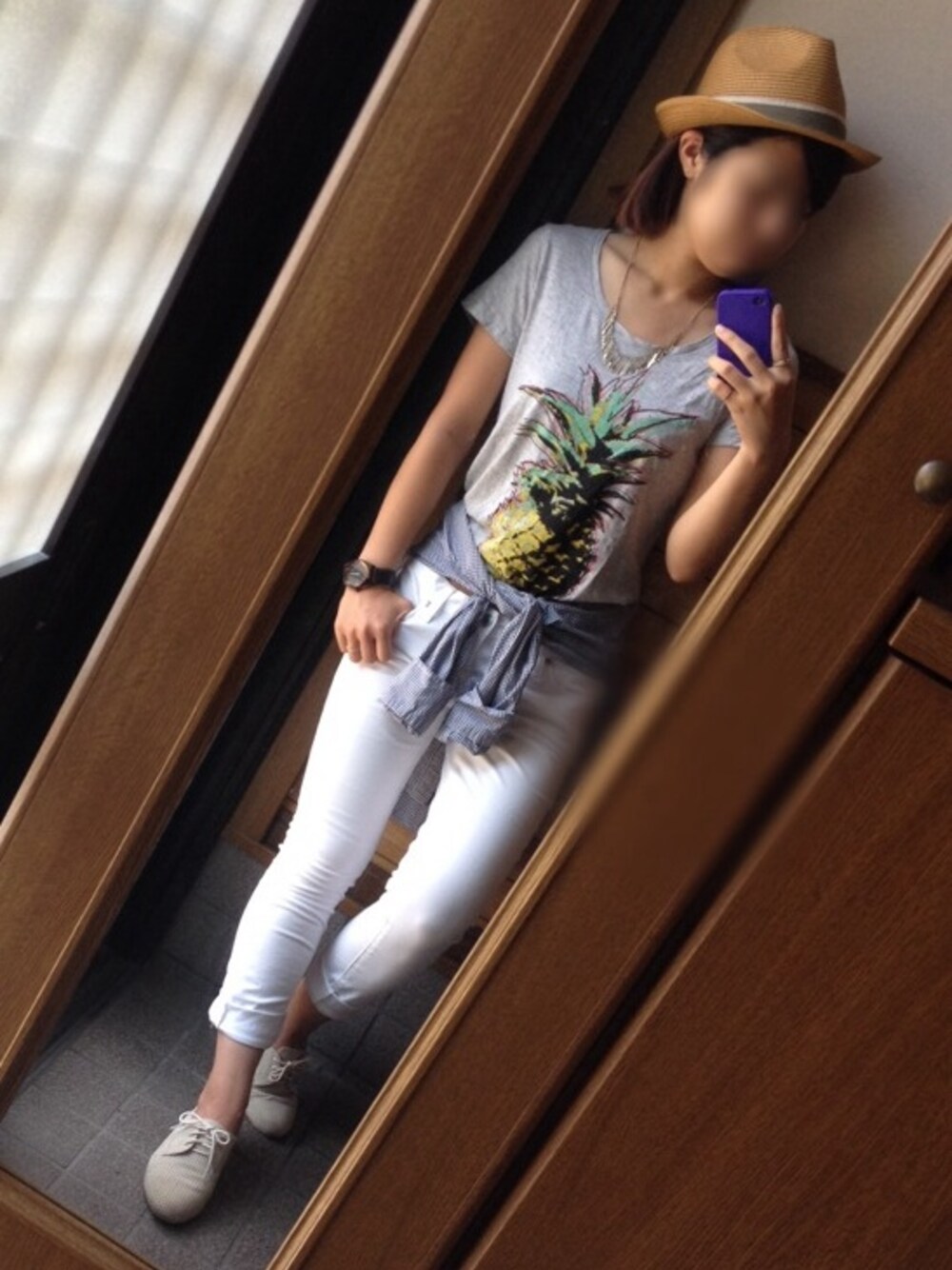 トップス:GU パンツ:GU シャツ:UNIQLO シューズ:ORiental TRaffic ネックレス:クレアーズ ハット:14+ 気づいたらGUとUNIQLOのプチプラコーデ☻ 細かいギンガムチェックのシャツはお兄ちゃんのを勝手に借りました〜