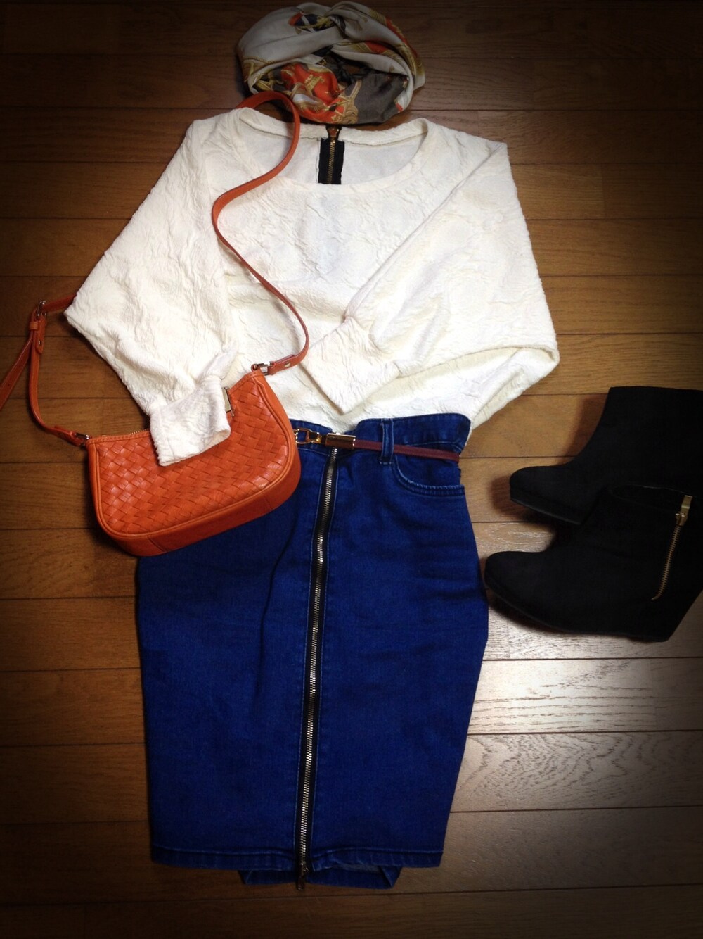 スカーフ:母のモノ トップス:COQULE スカート:COQULE ベルト:COQULE 靴:? 鞄:? トップスもスカートも靴もチャックだらけ(笑) 全身鏡が欲しい(´・_・`)