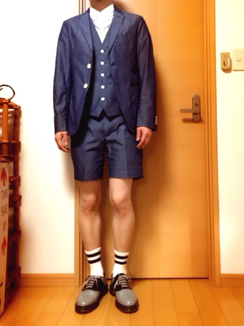 9 セットアップコーデ シャンブレーの ジャケット ベスト スラックス ショーツが セットでした! 全てWORLD (*´・ω・)