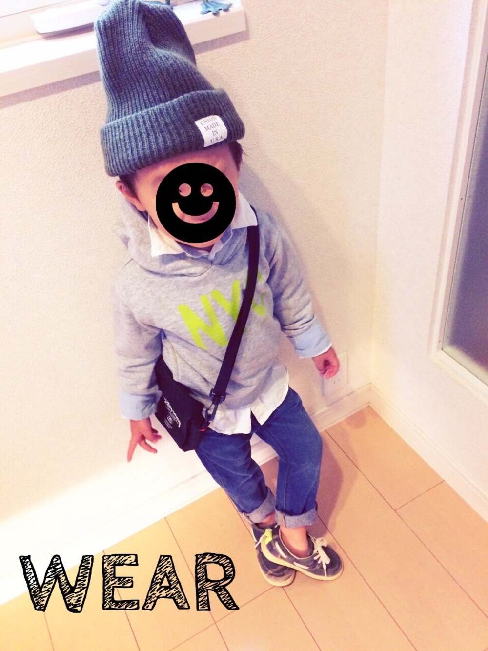 グレー系のパーカー、その他のスニーカー、ブラック系のショルダーバッグを着用したキッズの秋コーディネートの1枚目の写真