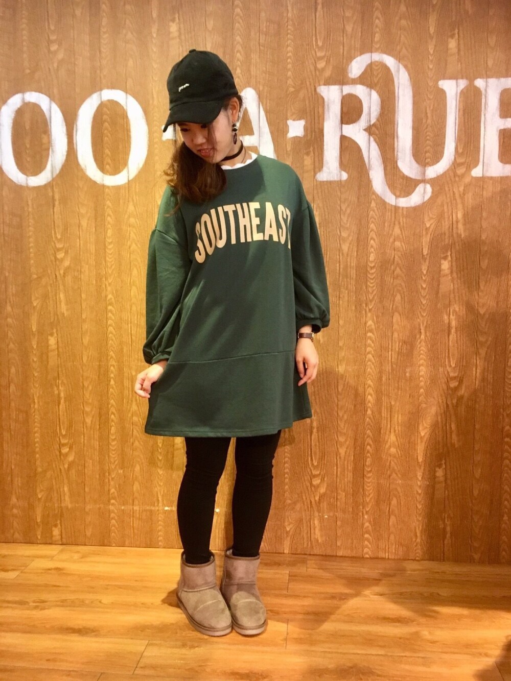 ご覧いただきありがとうございます😊 今日は、カジュアルコーデにしてみました😆 少し寒くなってきたので、裏起毛のスキニーパンツにスウェットワンピースをあわせてみました✨ 毎年大人気のムートンブーツ、今年も入荷してきました! 今年は微撥水加工がされており、少し濡れても大丈夫!中ボアなので真冬もあったかく履いていただけます😆🎵