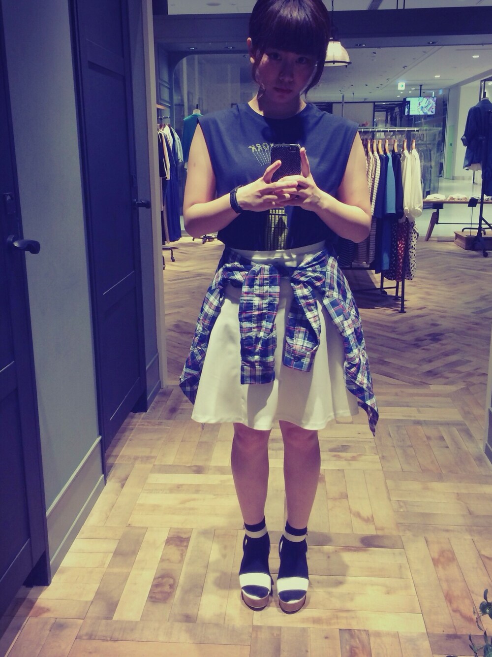 トップスと腰巻きのチェックシャツでボーイッシュ、プラス ホワイトのフレアスカートでガーリーをミックス。