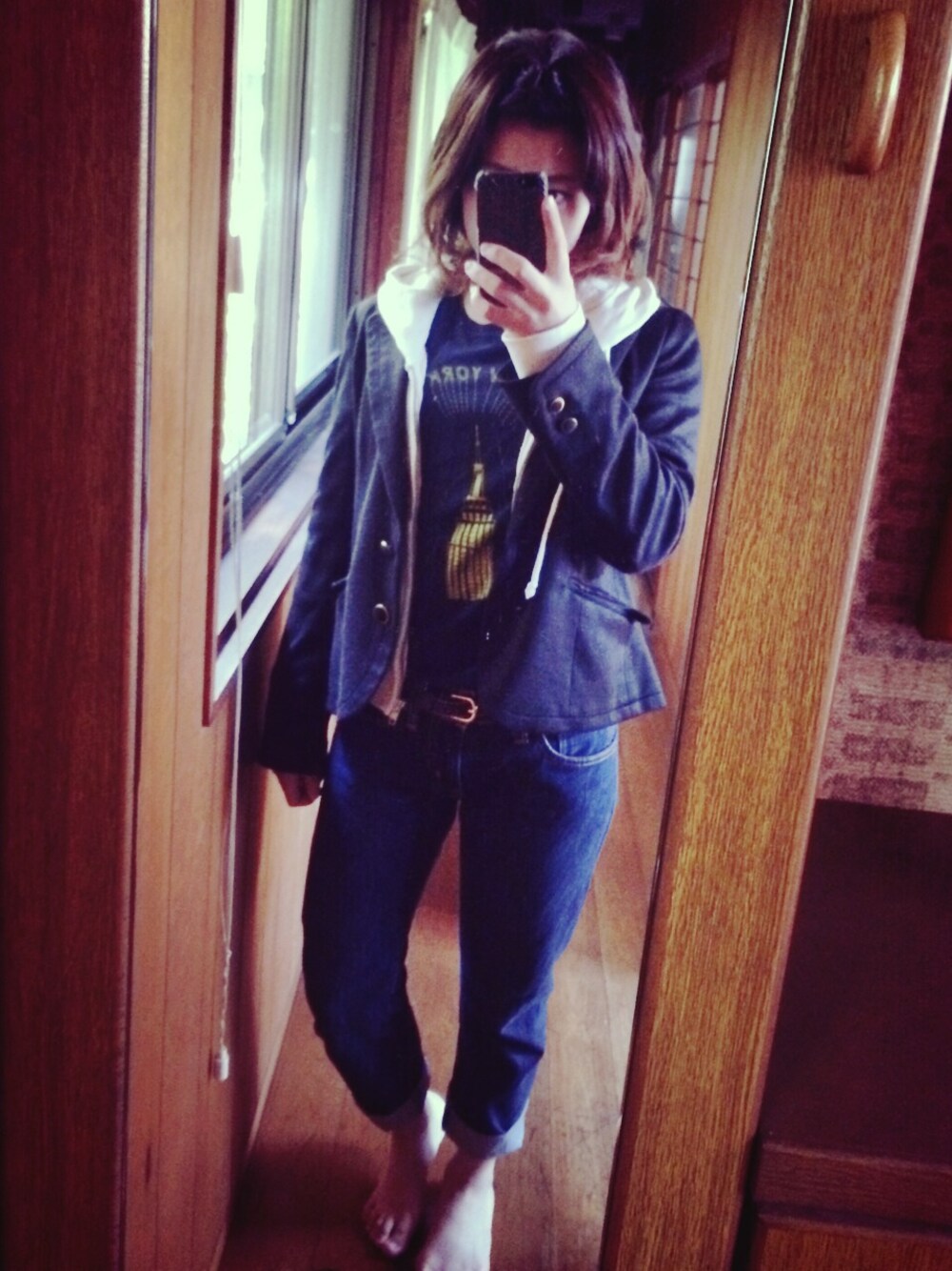 Tシャツ、パーカーの上にジャケットでミックスさせてデニムでカジュアルを決める。
