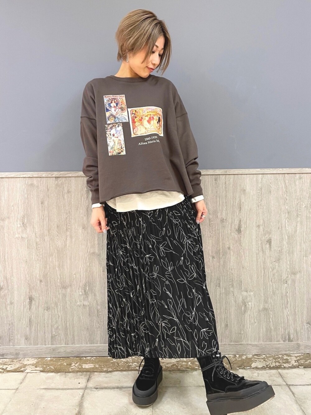 チェコの画家、ミュシャのアートを使った女性らしいアートプリントスウェット。 ラウンドスリットが特徴的。ゆったりシルエットでどんなボトムスとも相性抜群の1枚です。 厚すぎず薄すぎない生地感なので長い季節感で楽しんでいただけると思います☺︎ Other ♢ アートプリントトレーナー ¥4,000(¥4,400) HONEYSUCKLE ROSE ♢ 線画プリーツスカート ¥4,000(¥4,400)