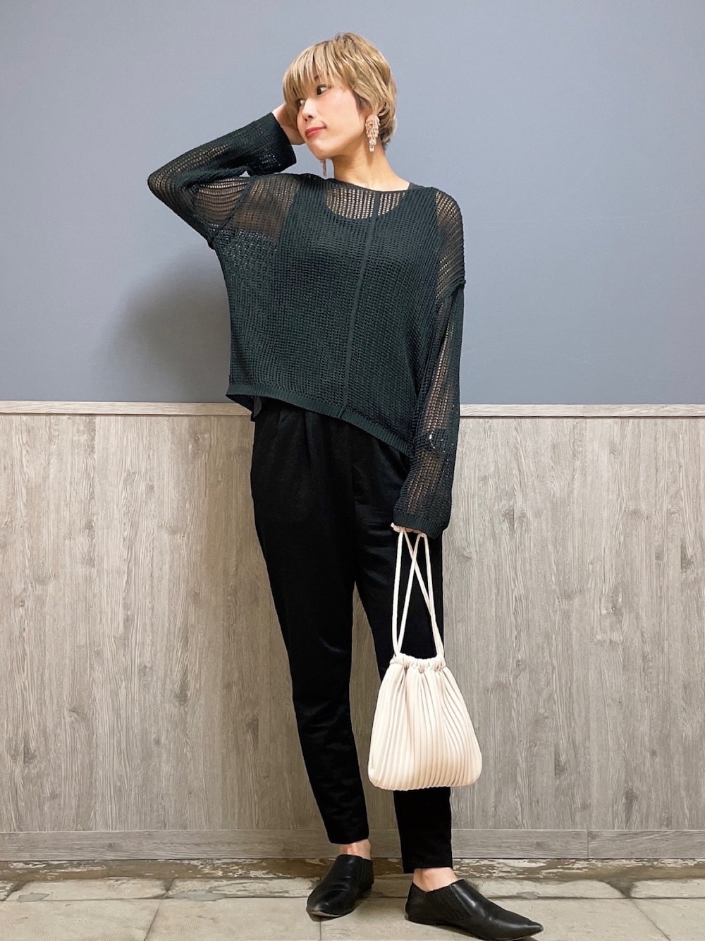 BLACKコーデ⭐️⭐️ サッと着るだけでトレンド感満載のメッシュ編みレイヤード✨✨ インナーのタンクトップとのSETアイテム🥳程よいゆったり感と、程よい透け感が女性らしさをUPしてくれます💕💕 スッキリ目のパンツと合わせると大人っぽく🥺✨ ゆったり目のパンツと合わせるとカジュアルに😜✨ 今回合わせたパンツは、大人気の楽ノビシリーズ⭐️⭐️ 楽伸びSUMMERテーパード‼︎‼︎🤩🤩 サラッとした生地感がとっても気持ち良いです。 ウエスト周りゴムになっていて楽チン⭐️ 腰回り太もも周り、ゆっくりシルエットで楽チン⭐️ 膝下に掛けてスッキリで脚長効果⭐️⭐️ こちらも1本あると着回し👍👍 ウエスト部分に紐があるので調整も可能です⭐️⭐️