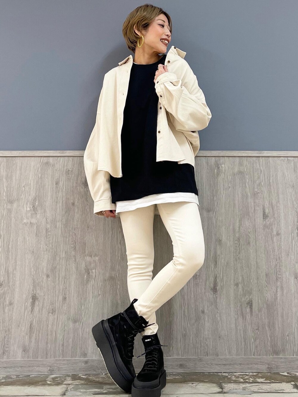 ブラック✖︎ホワイトコーデ⭐️⭐️ LeeのバックプリントロンTにオフホワイトの楽ノビスキニーでシンプルに合わせてみました‼︎ ホワイトデニムシャツはショート丈&ビッグシルエットになってます。 サッと羽織るだけでトレンド感を楽しめます🥳🥳 デニムジャケットは、何枚あっても欲しくなっちゃいます。 厚すぎない生地感で、長い季節を一緒にお供してくれること間違いなしアイテムです😊 そして、後ろ姿にインパクト大のロンTが仲間入りです。 LeeのロンTはRight-on別注なので他とは被らないアイテムです🥳 幅広い年齢層の方々が手に取りやすいデザインなので1着あれば長い季節感で沢山の着回しコーデが楽しめます🙂 厚すぎず薄すぎずゴアゴアしないのが嬉しいポイント‼︎ お尻周りが気になる方はレイヤードをしてお洒落度を更にUP⤴️ そして、大人気の楽ノビスキニー‼︎👖 こちらは、名前の通り本当に楽チンです。 楽でお洒落が楽しめるのは最高ですね✨ レギンスの様な履き心地ですが、スッキリと脚長に演出してくれます。 お尻にポッケも2つあるので美尻効果も期待できます✨✨ ぜひ春色コーデのお洒落を楽しんでみて下さい💓 163㌢ジャケットLサイズ、トップスLサイズ、インナーMサイズ・パンツSサイズ着用です。