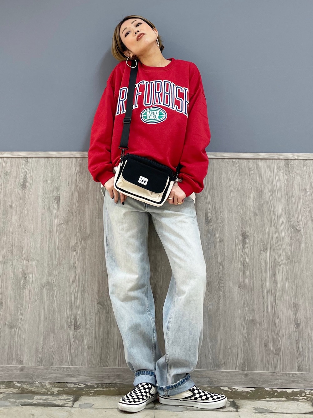 スウェットコーデ⭐️⭐️ レッド✖︎ホワイト✖︎デニム✖︎ブラックで合わせて見ました‼︎ パッと目を引く赤色スウェットは、1枚で十分、主役になっちゃいます♪♪ 厚過ぎない生地感のスウェットは長い季節感で着回しを楽しめる1着です🌈 カラーによって楽しめるロゴにも注目です。 カラーのバリエーションも多いので、お好きな1着を見つけてくださいね‼︎ そしてLevi'sのステイルーズは、レディースの方にも、ゆったりシルエットをお洒落に楽しめる1本です👖 程よいゆったり感にLevi'sならではの色落ち具合‼︎ そしてさり気なくポケット付近にあるダメージ👻👻 ストレッチは入っていないですが硬すぎない生地感になっているので、こちらも是非お試ししてみて下さい。 お気に入りの1本になると思います😆🌈 163㌢スウェット(men'sアイテム)Lサイズ・インナーMサイズ・デニム(men'sアイテム)28インチ着用です。