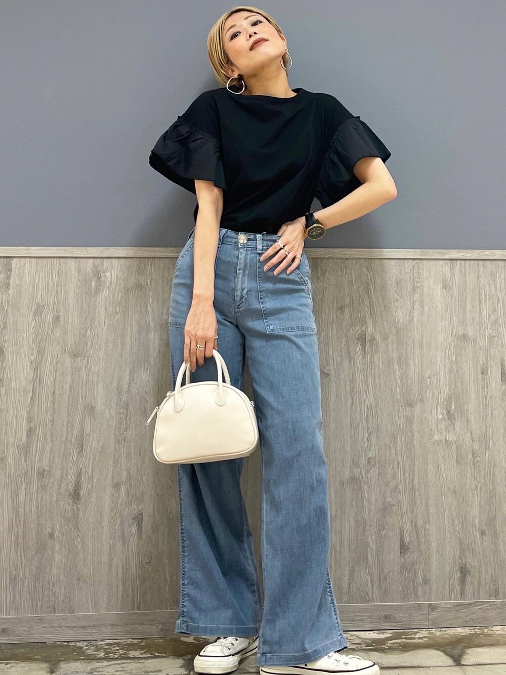 サマージーンズ⭐️⭐️ ブラック✖︎ブルーで合わせてみました‼︎ 袖のフリルがシンプルなのに存在感抜群な1枚🤩 フリルが甘すぎず大人可愛く演出してくれます💕💕 カラーのバリエーションも多く、1枚で十分コーデの主役になります。 自分好みの1枚を見つけてくださいね🤗 そして、SOMETHINGの「COOL」ベイカーワイドパンツ👖 軽いくて肌に優しい履き心地‼︎ 長時間はいていてもサラッとしていて、とても動きやすいので夏場もノーストレスでジーンズを楽しんでいただけます😝😝 何より洗濯してもすぐに乾いてくれるので嬉しいです😆😆 毎年、大人気のSOMETHINGのCOOLボトム是非お試しくださいね♪♪♪ 163㌢トップスMサイズ・パンツ27インチ着用してます。