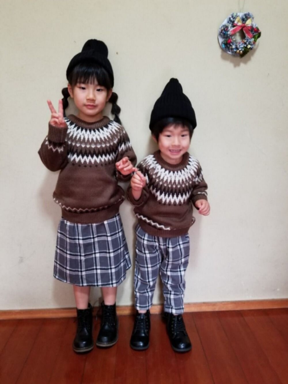 見ていただきありがとうございます🙇✨ 今日はお揃いコーデ❤ プティの求心柄ニットとオーシャンのチェックパンツ&スカート💓 ブーツとニット帽もお揃い👦👧