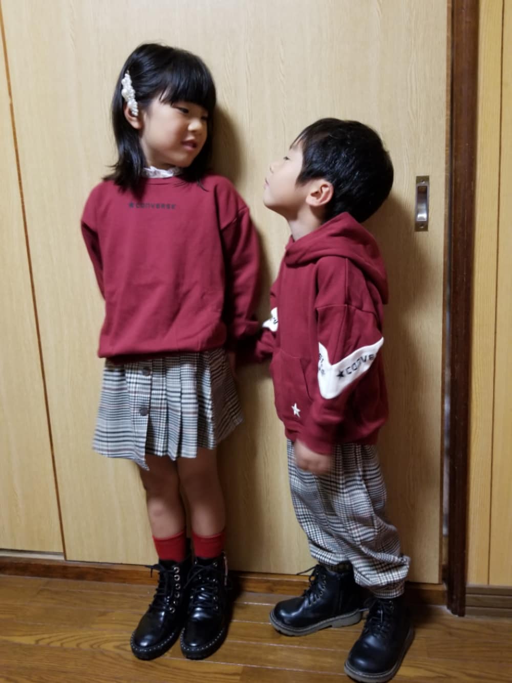 見ていただきありがとうございます🙇✨ ブランシェスさんのCONVERSEのトップスでリンクコーデ❤ モデルさんが着ているのが可愛くて購入しちゃった😍💓 チェックのボトムスとブーツで🎵