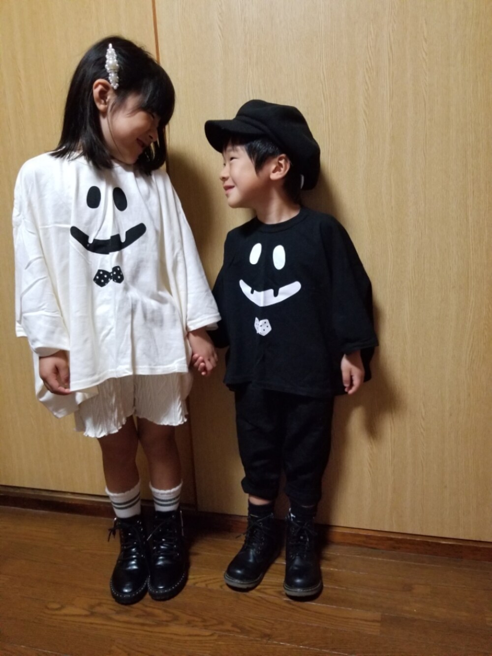 見ていただきありがとうございます🙇✨ #wearhalloween みんなおばけTコーデ載せてたので便乗して😜🎵 去年のおばけT❤ 👧白コーデ 👦黒コーデ にしてみました☺ 嬉しそうな2人🎵