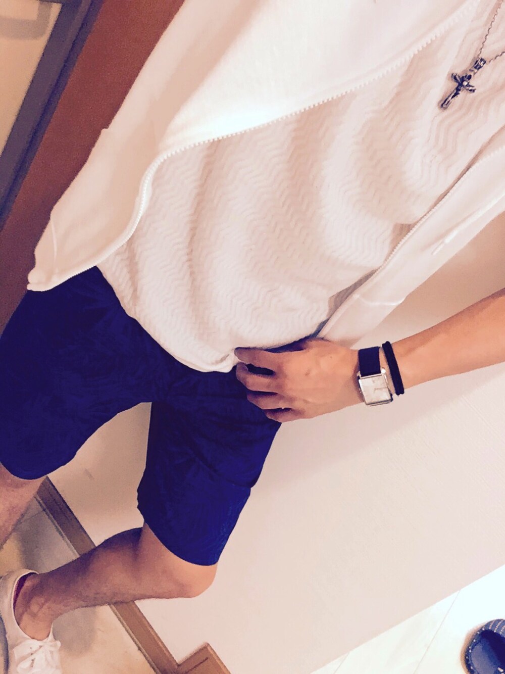 SUMMER Style! 白パーカー×サマーニット 青ハーフパンツ×白スニーカー