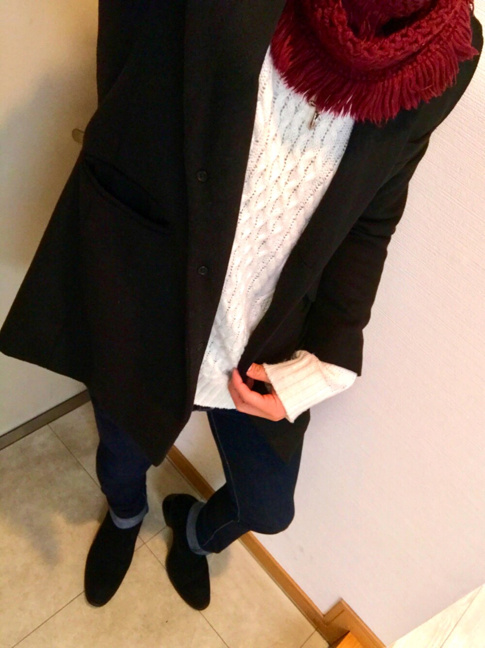 冬コーデ。 vicci ウール混チェスターコート× vicci 白ニット×AZUL マフラー×VANQUISH スキニーデニム×JACKROSE ドレスブーツ チェスターコート買ったの忘れてて、今日初卸し。 白ニットと、ボルドーのマフラー巻いて。 Xmasのタグにちなんで、ドレスコードっぽい感じで。。 これならお洒落なレストランいけそうな 笑 そんなにお金無い無い〜。 今年のXmasは何貰えるやろうな〜。