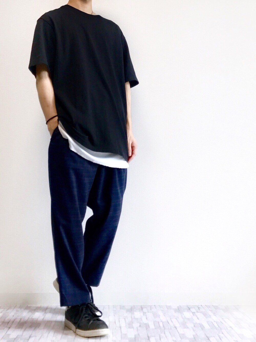 おはようございます♪ 今日は最近ハマっているブラックコーデです! 安定のUNIQLOのビックTと、RAGEBLUEで一目惚れしたスラックスパンツ履いてます♪ シンプルでいいですよね? このパンツですが、色は濃い目のネイビーです。チェック柄が可愛すぎます笑 シルエットも良い感じで満足のアイテムです! 少しでも良いなと思ったら、いいね お気に入り お願いします♪ __________________________ 【size】 Tシャツ XL レイヤード L パンツ S スニーカー 26