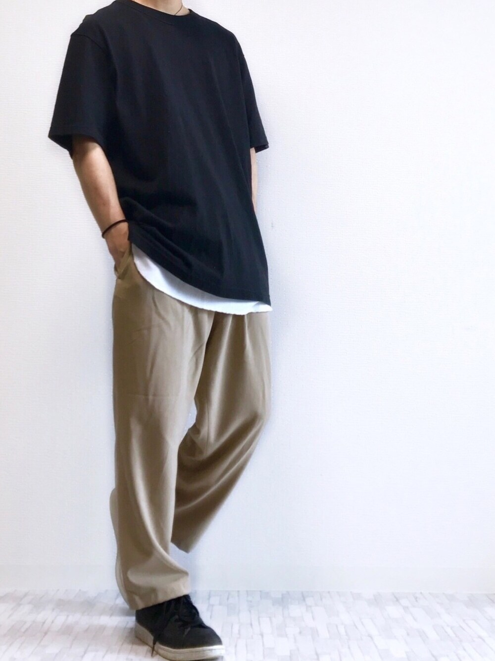 しんぷる ベージュ✖︎ブラック 安定コーデ __________________________ 【size】 Tシャツ XL レイヤード L パンツ S スニーカー 26