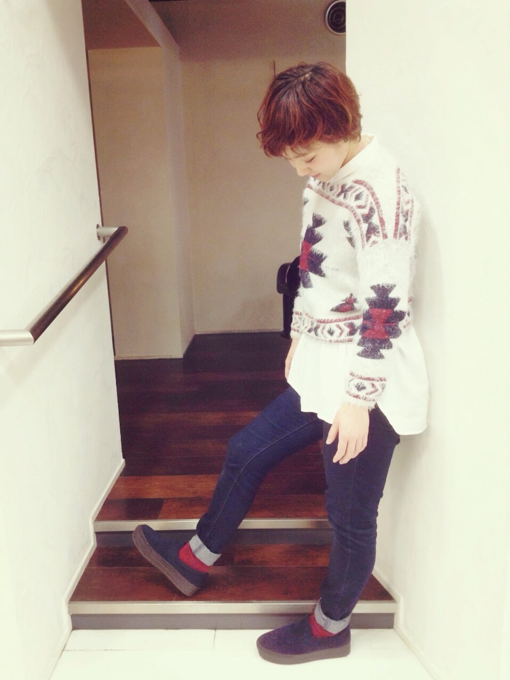 エスニック風のセーターを シンプルに来こなしたくて 白シャツを合わせた♡ デニムからのぞかせた赤ソックスが セーターの柄とマッチして 今日のpoint♪( ´θ`)ノ チャイハネで買ったターコイズ付きの ピアスも お気に入り! お客様にもスタッフにも褒められた
