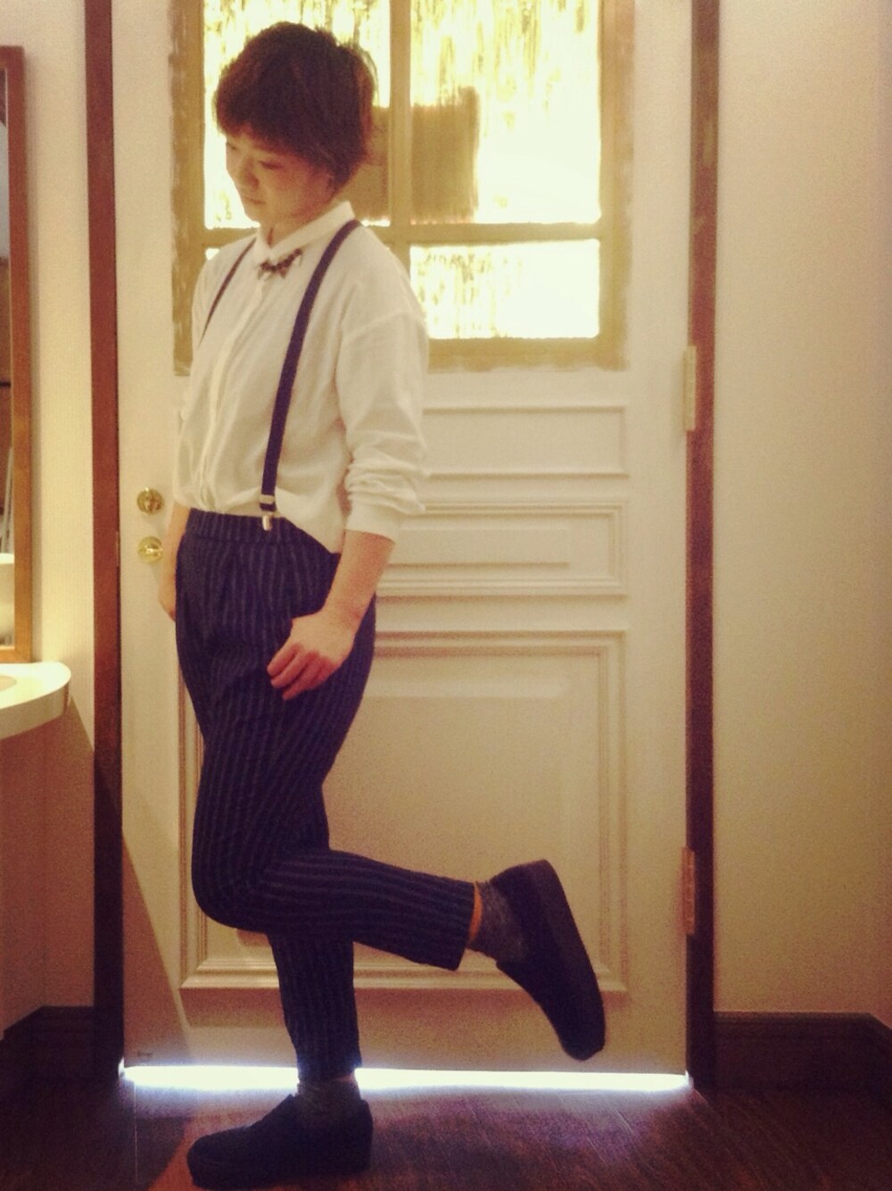 サスペンダーがpoint!(^ ^) 外国の子供みたいな感じ! 蝶ネクタイがあったらベスト? なくて、ネックレス( ̄▽ ̄)