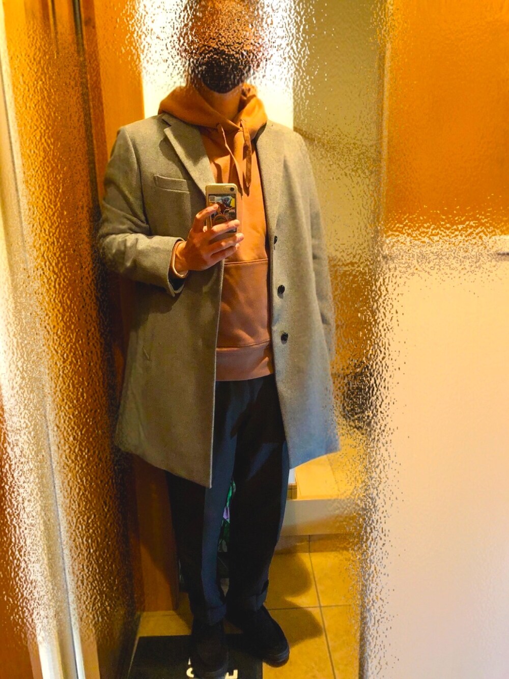 ペールトーンのパーカーにライトグレーのチェスターコートを合わせてみました。 パンツとシューズはダークグレーのワイドスラックス、ブラックのチロリアンシューズで落ち着いた感じにしました。