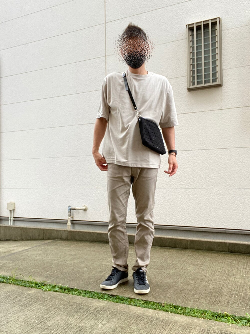 トップスとボトムをベージュで合わせました。 明るい色での同系色コーデは初めての試みで、若干そわそわしてしいました笑 マスクとショルダーバッグとスニーカーを黒にしました。