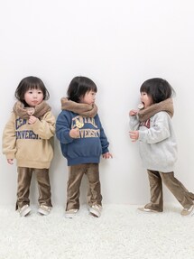 ブラウン系のニット/セーター、ブラウン系のその他パンツを着用したキッズの冬コーディネートの1枚目の写真