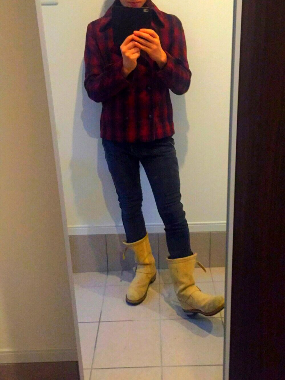 黒のタートルネックを着て赤のチェックのPコートを着てみました! 画像ではわかりにくいですがあえてズボンも黒のチェックにしてちょっとオシャレに! それとちょっと下がさびしかったのでアクセントにベージュのブーツをはいてみました\(^o^)/ これからの季節オシャレ楽しみます!