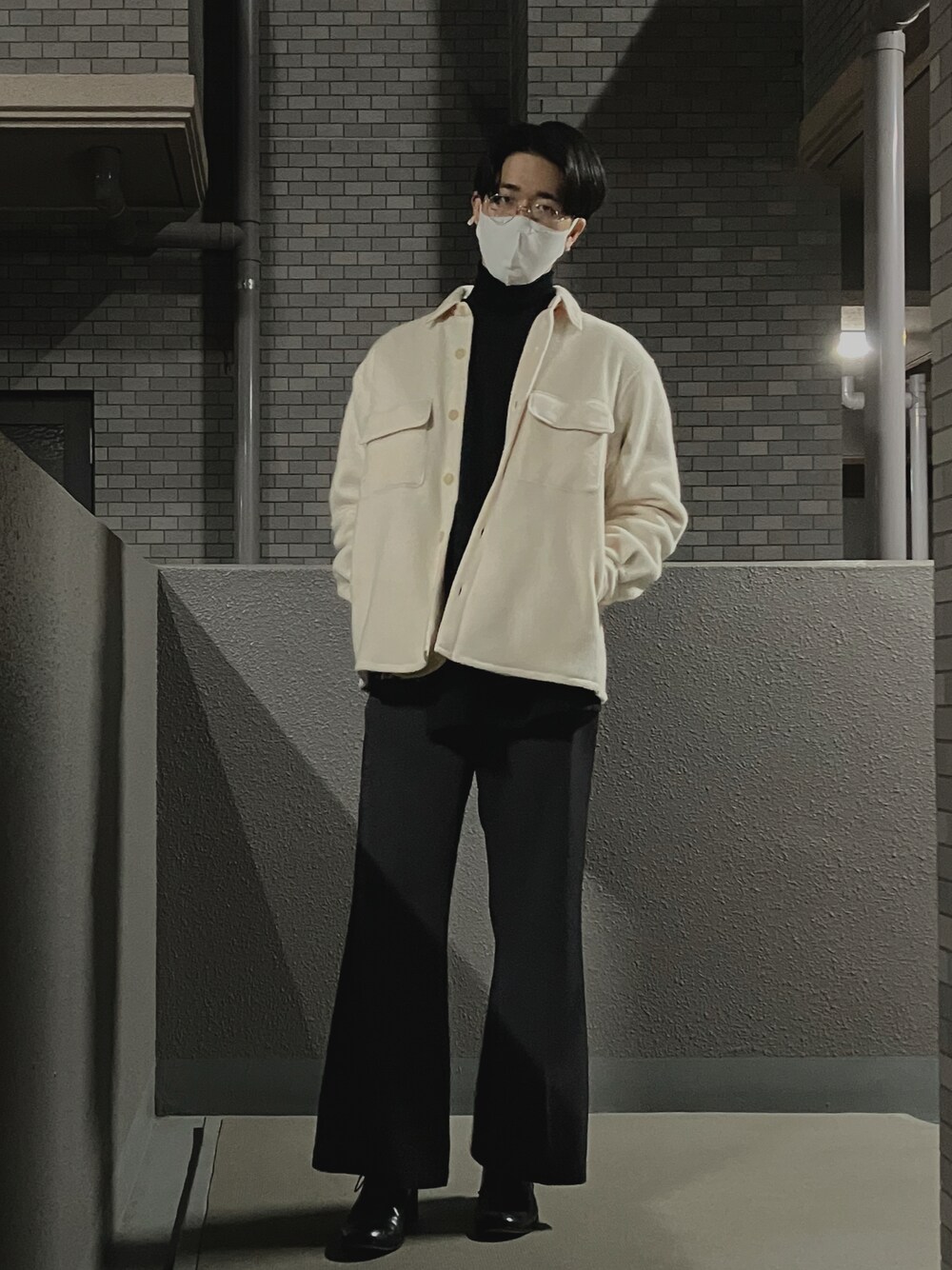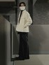 ダークトーンでまとめながらYOKEのフリースシャツの白でおもたさを中和 フリースシャツはふわふわで暖かいのでこの時期のアウターにもピッタリです✨