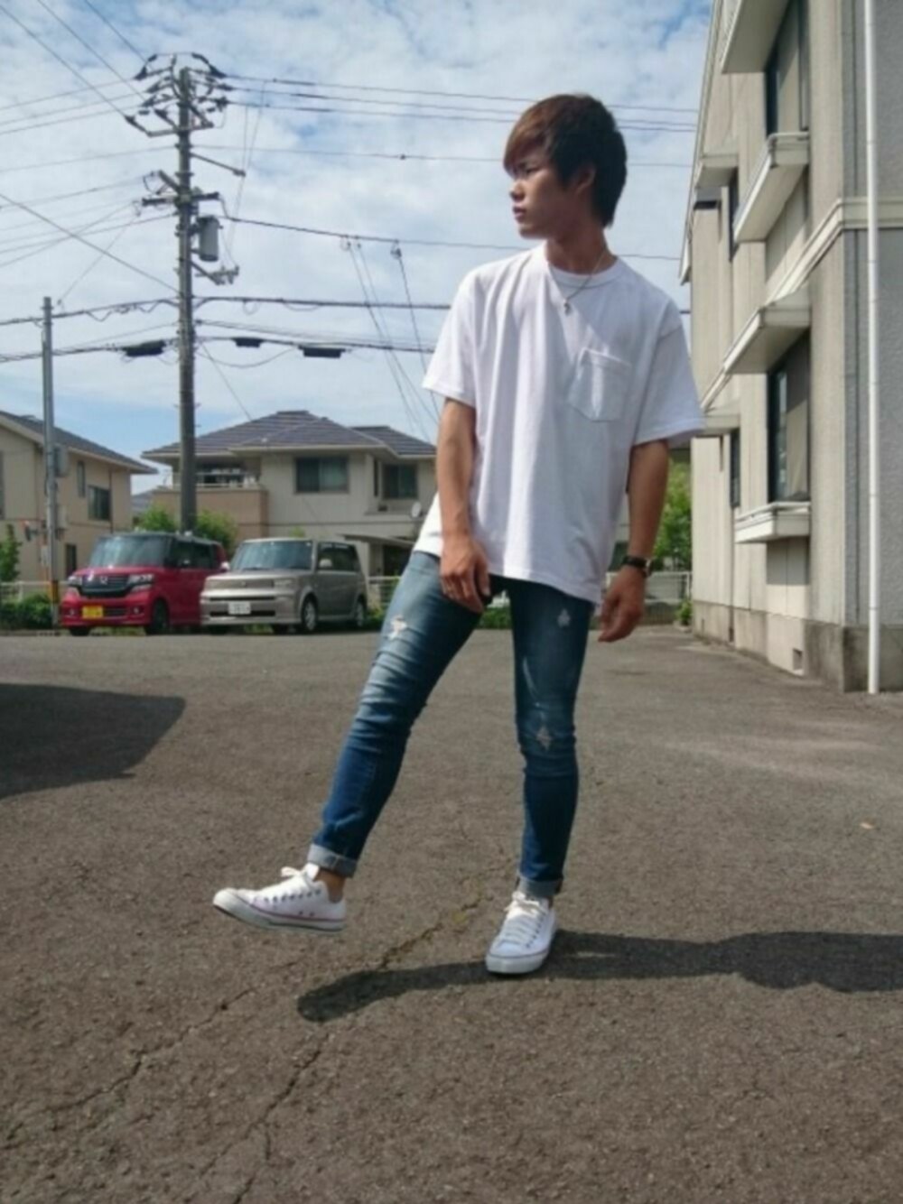 👏今日のコーデ紹介👏 ダメージデニムをつかったシンプルな夏コーデです! ダメージが入っているのでカジュアルになりすぎないようにシンプルなビックTと合わせました! スニーカーもシンプルな白のコンバースと合わせました! 白、青、白というコーデで、夏っぽくてお気に入りのコーデです😜👍 サイズ詳細 ビックT→M デニム→S