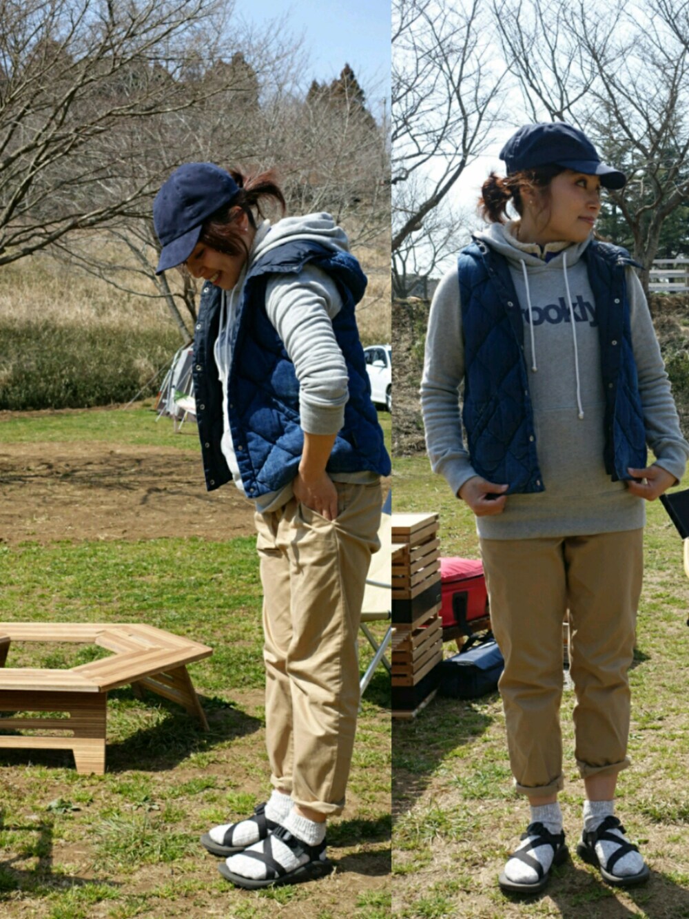 3月のデイキャンコーデです☀ patagoniaのフリースベストをレイヤードしたのですが、思いの外暖かく、いらなかったな…と思いました😅 無印のチノは動きやすく、生地感もしっかりしていてアウトドア向きだと思いました✨ RockyMountainのインディゴベストはコーデしやすくとっても気にいっています❤