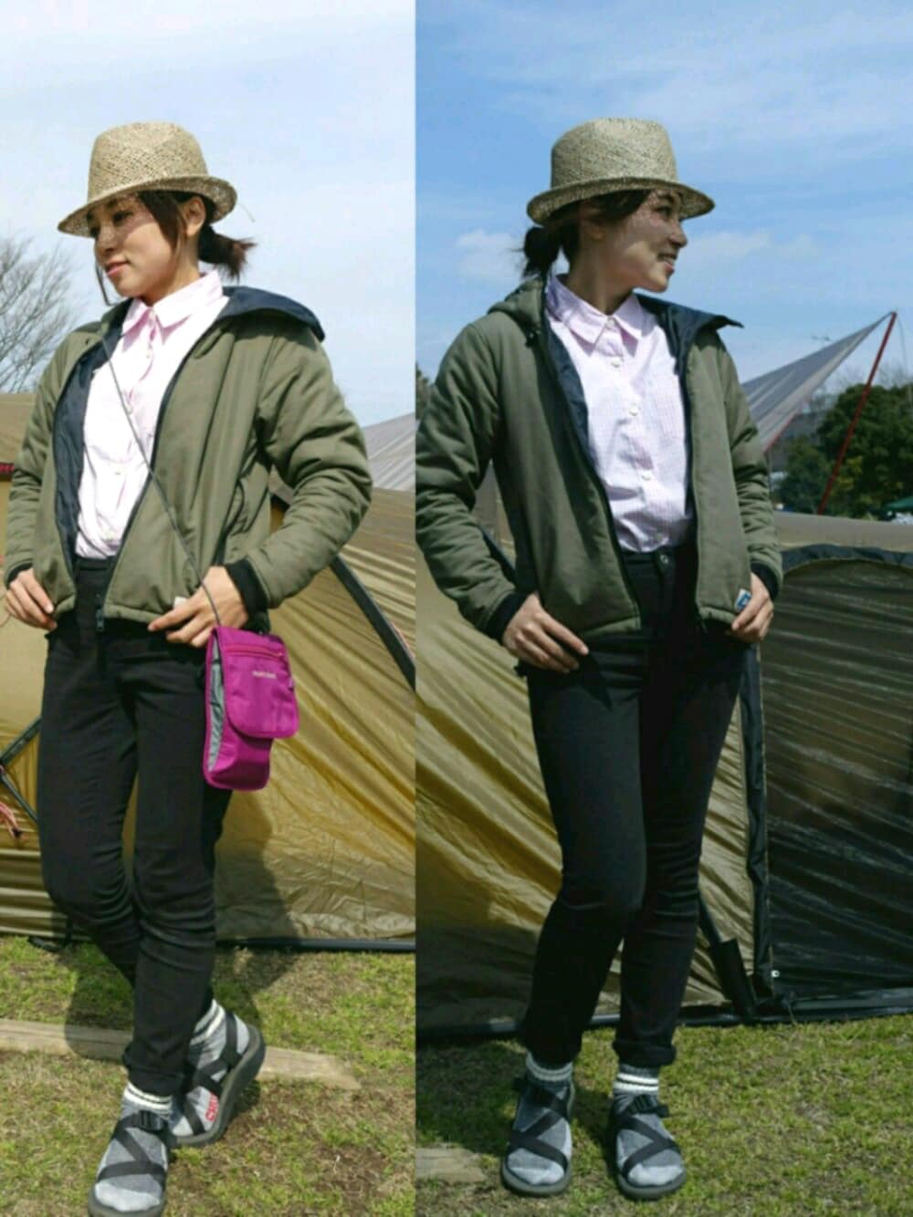 4月初旬のデイキャンプ☀ 風が冷たいのでアウターは保温力高めです🍀 Columbiaのギンガムチェックシャツがかわいい💛 このハットは何にでも合いそう😍😍