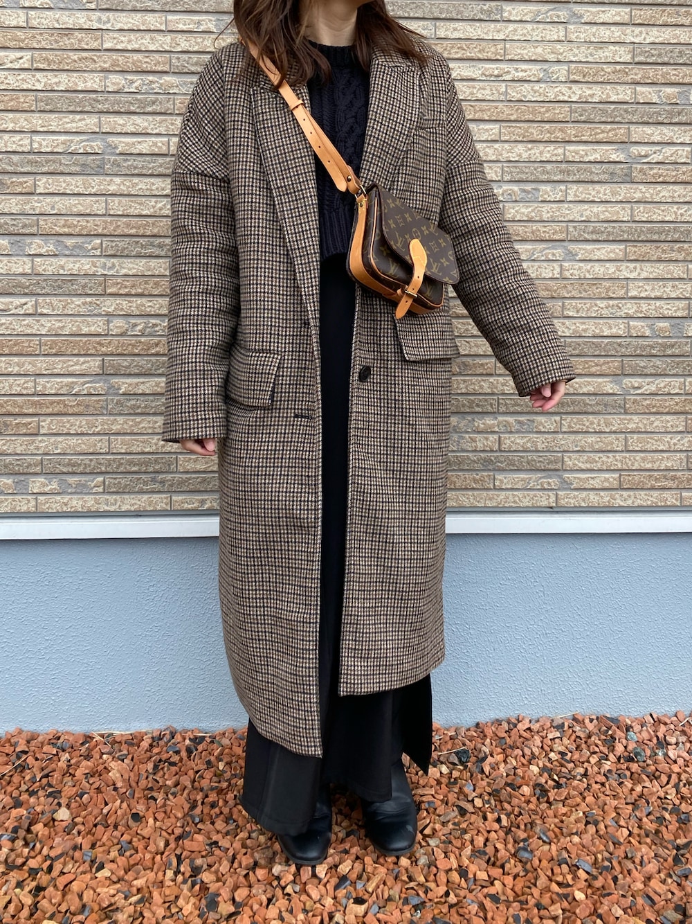 チェックコートを主役に、他を黒多めに