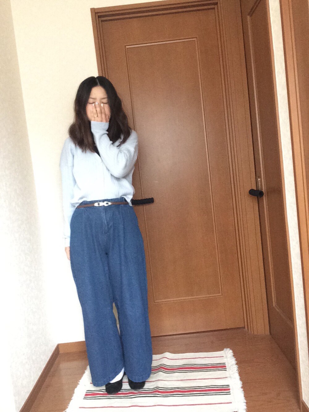 出勤コーデ☆ 分かりずらいけど、サックスブルーのカーデにレース付きインナー着てます☆^ ^ ハニーズのレース付きインナー安くて使えてかなりおすすめです!!