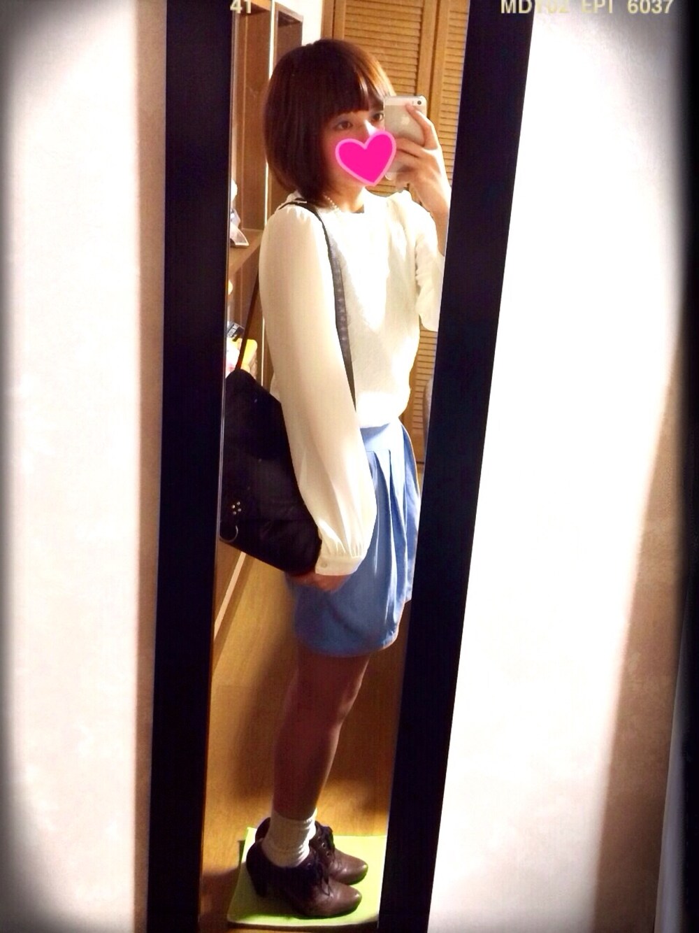 mysticのスカートのウエストがゴムなので楽チン♬水色だから夏にかけて着れます♡ トップスと靴下を白にしてキレイめなコーデにしました☻ 髪切って、パーマかけたんですけどあんまりわからないっていう…( ´ ▽ ` )笑