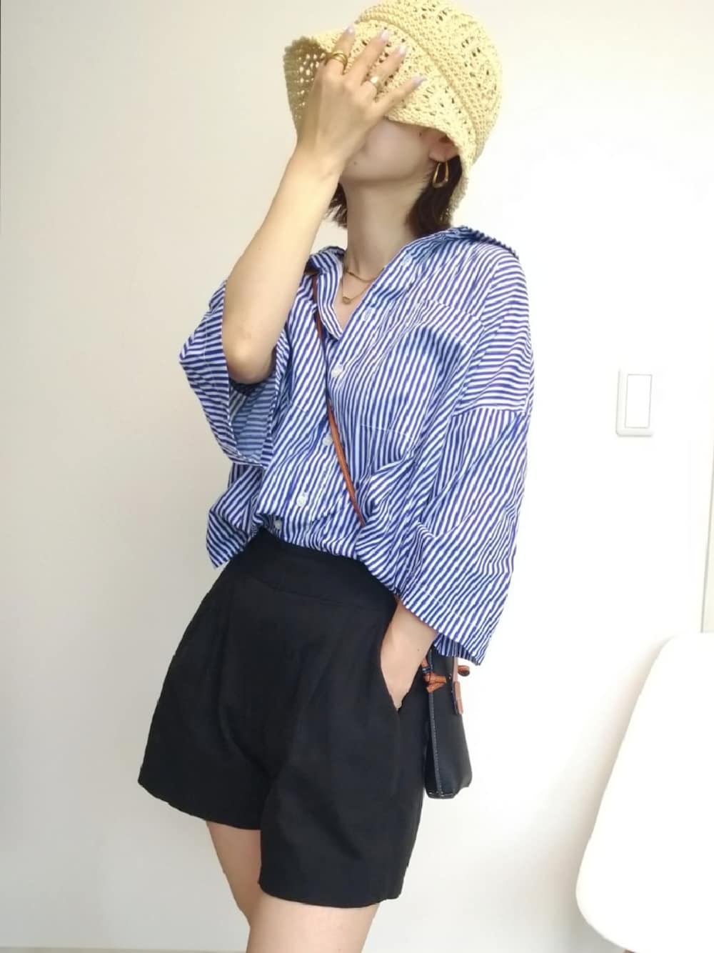 yu.のシャツ/ブラウス「シアー オーバーサイズ レギュラーカラー半袖シャツ / 無地 / ストライプ」を使ったコーディネート
