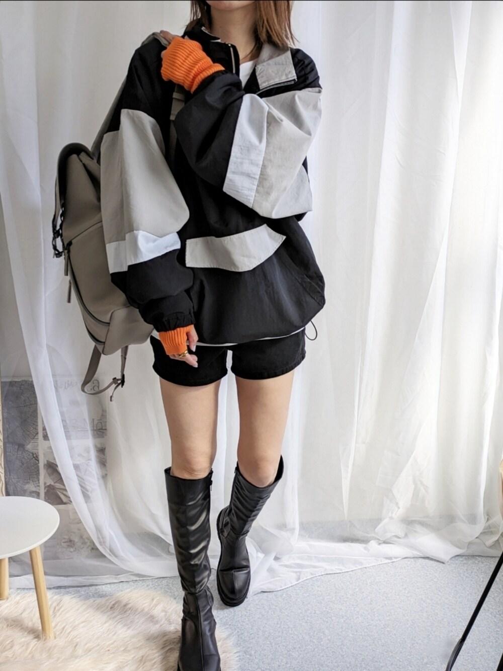 yu.のナイロンジャケット「25AW ビッグシルエット トラックジャケット ナイロンブルゾン ハーフジップアノラックプルオーバー 【ILL'S】」を使ったコーディネート