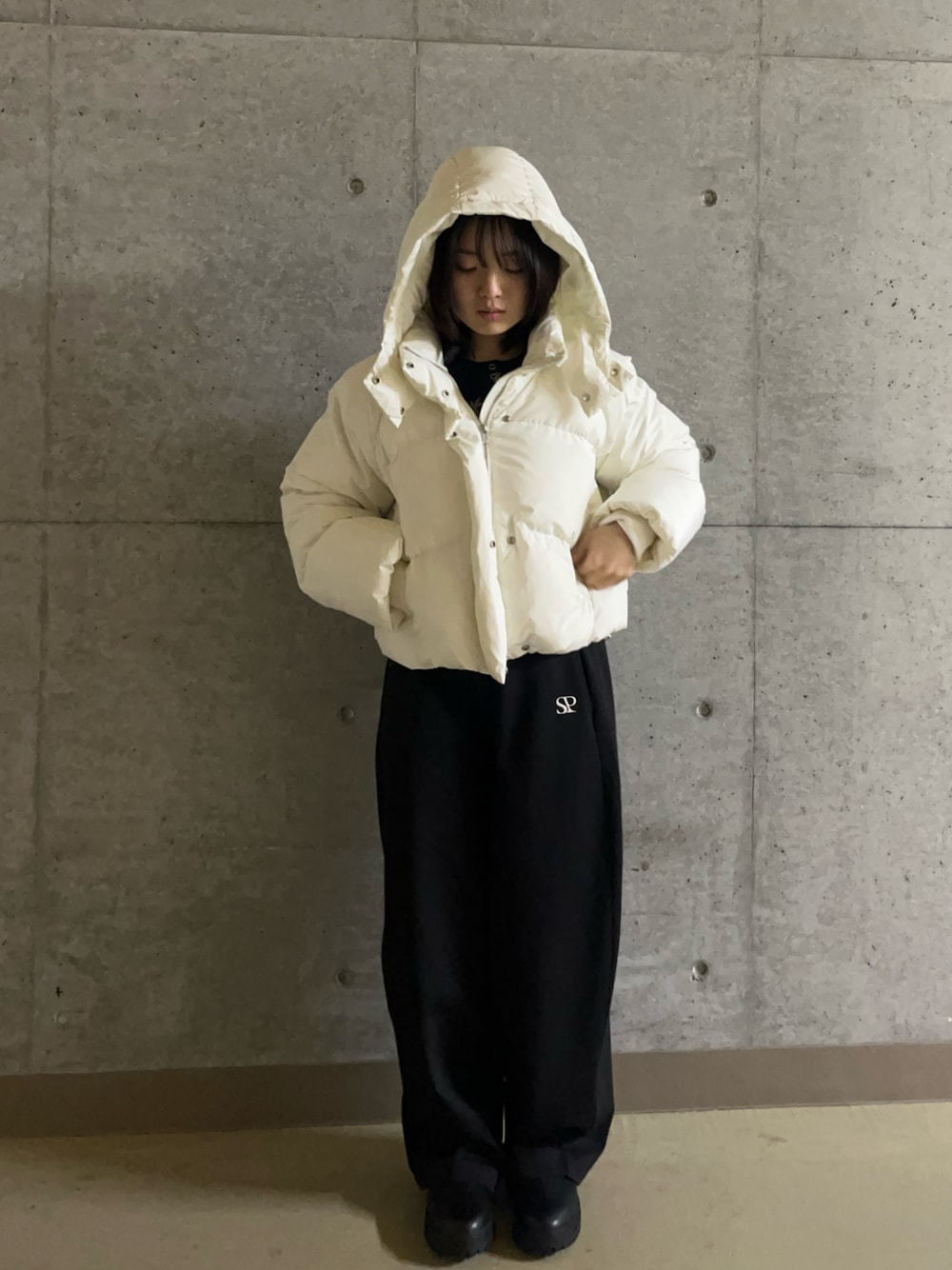 ボリュームのある白ダウンを主役に、全体をモノトーンでまとめた大人カジュアル。ラフなのにスタイルよく見えるのがポイント。ダウンとフェザーが半分入ってるのも魅力です