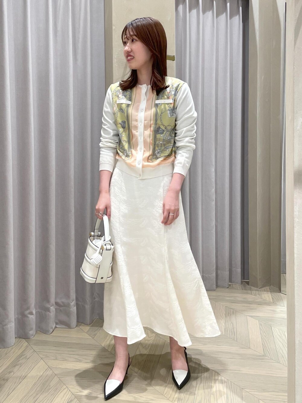 スカーフ柄のトップス・カーディガンに マーメイドスカートを合わせたフェミニンコーデ! カーディガンと名前がついていますが ボタンを閉めると1枚着としても使える 着回しのきくアイテムです。 スカートはラインがキレイで マーメイドスカートならではの 裾の揺れ感が可愛くポイントです♪ 春のお出かけにもぴったりのコーデです◎